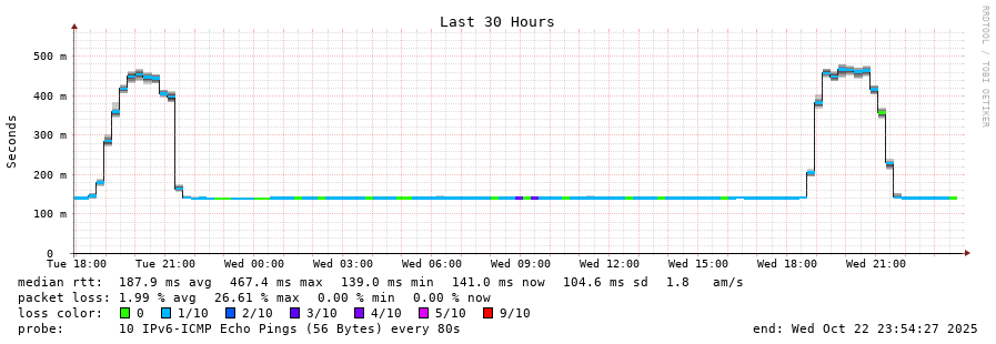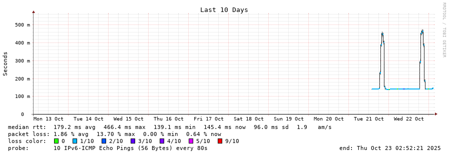 traceroute to 2001:4350:1:1::ff90 (2001:4350:1:1::ff90), 30 hops max, 80 byte packets - Generated at 2025-10-22 07:45:01
