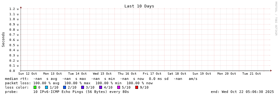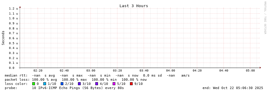 traceroute to fd9b:f75:a3d5::2 (fd9b:f75:a3d5::2), 30 hops max, 80 byte packets - Generated at 2025-10-21 18:15:01 3 > telia.as1299.tx.us (2607:5300::2609) [AS16276] 20.403ms 4 > telia.as1299.tx.us (2607:5300::2609) [AS16276] 20.482ms !N20.610 ms!N