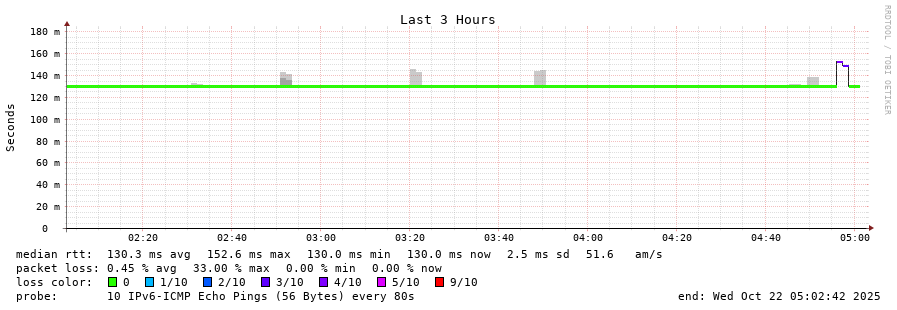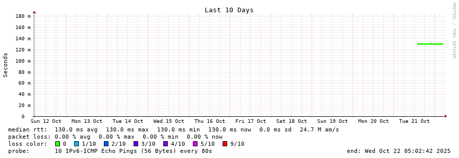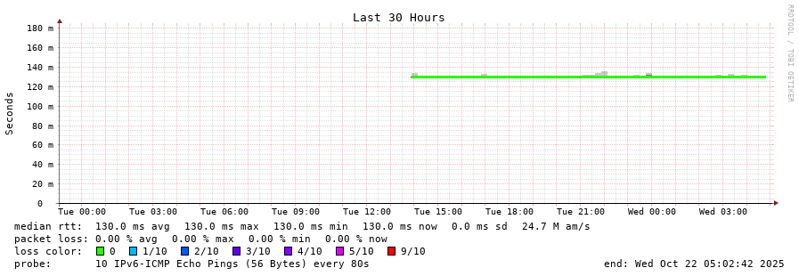traceroute to 2a00:c30:bbbb:d::2 (2a00:c30:bbbb:d::2), 30 hops max, 80 byte packets - Generated at 2025-10-21 18:15:01